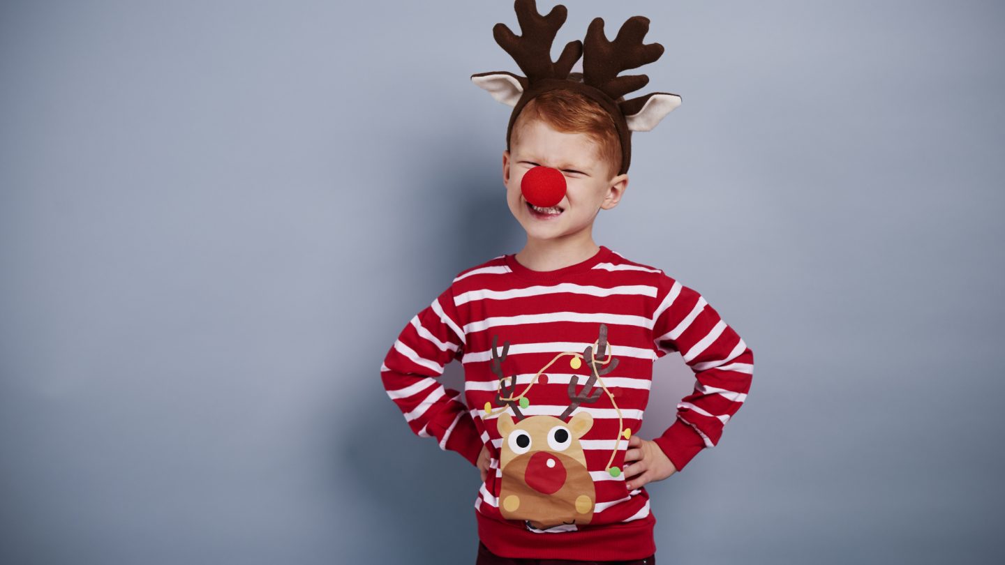 Image: A primary school-aged boy wearing a Christmas jumper, reindeer antlers and a red nose, posing and smiling.
