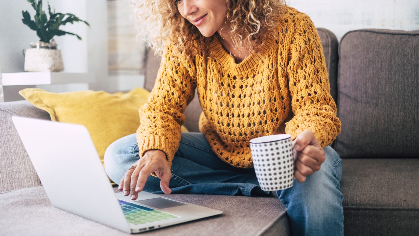 Image: A woman sitting on a sofa using a laptop and holding a drinking mug.