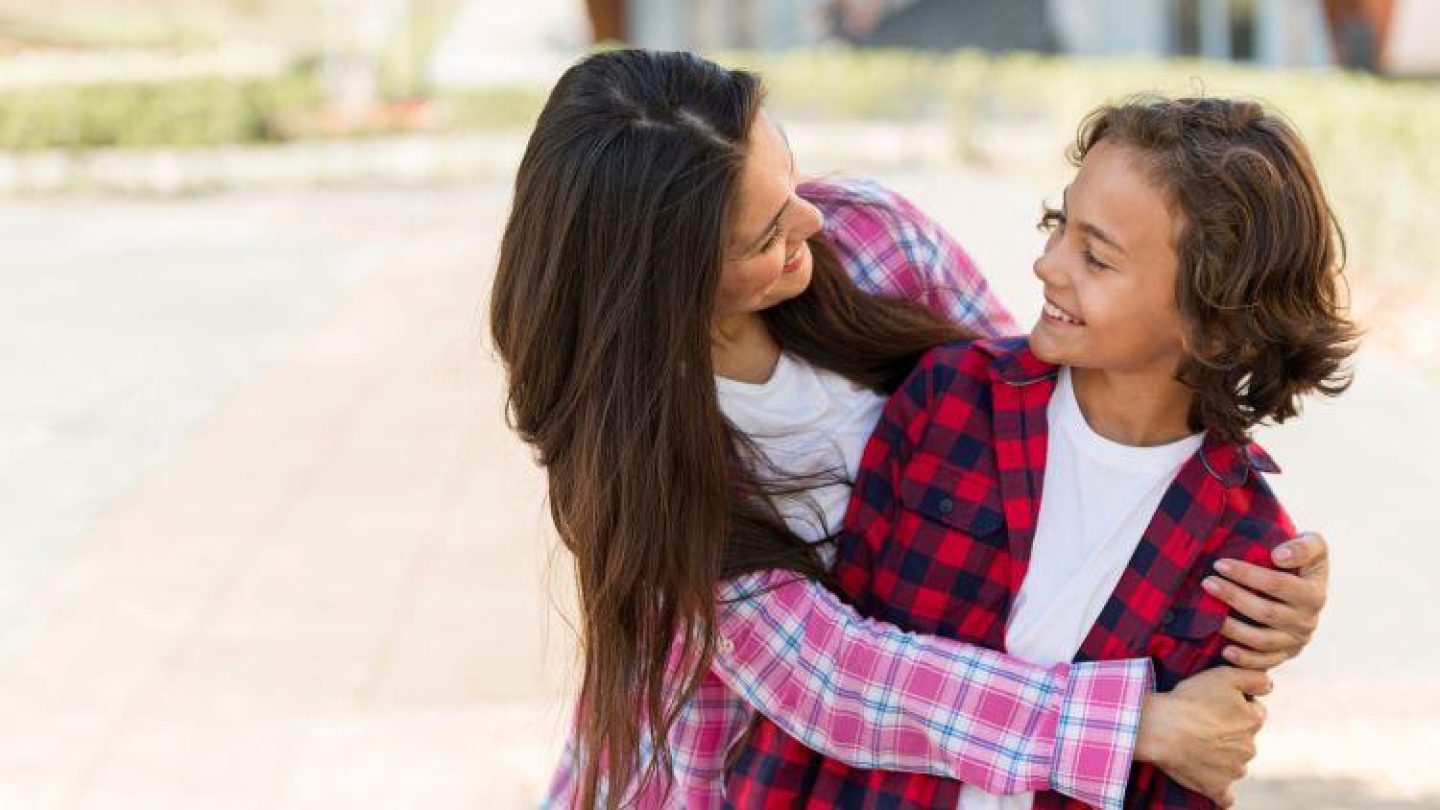 Image: A mother and son looking at each other, smiling.
