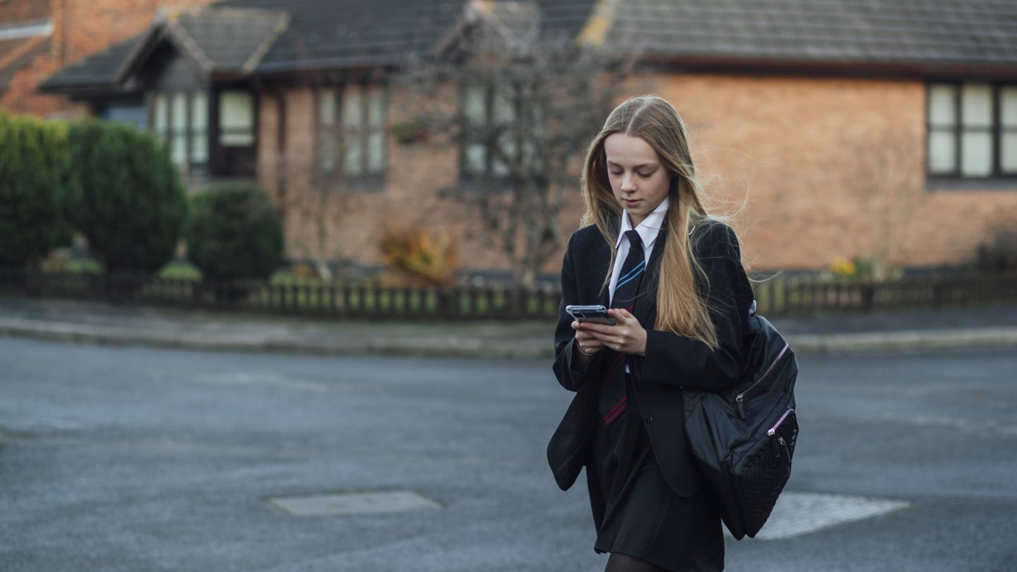 Image: Teenage girl walking down the street, looking at a mobile phone.