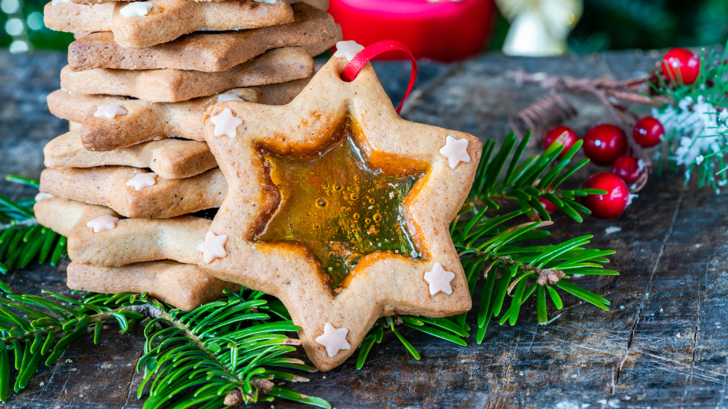 Image: A stack of fresh star-shaped cookies nestled in a Christmassy table arrangement.