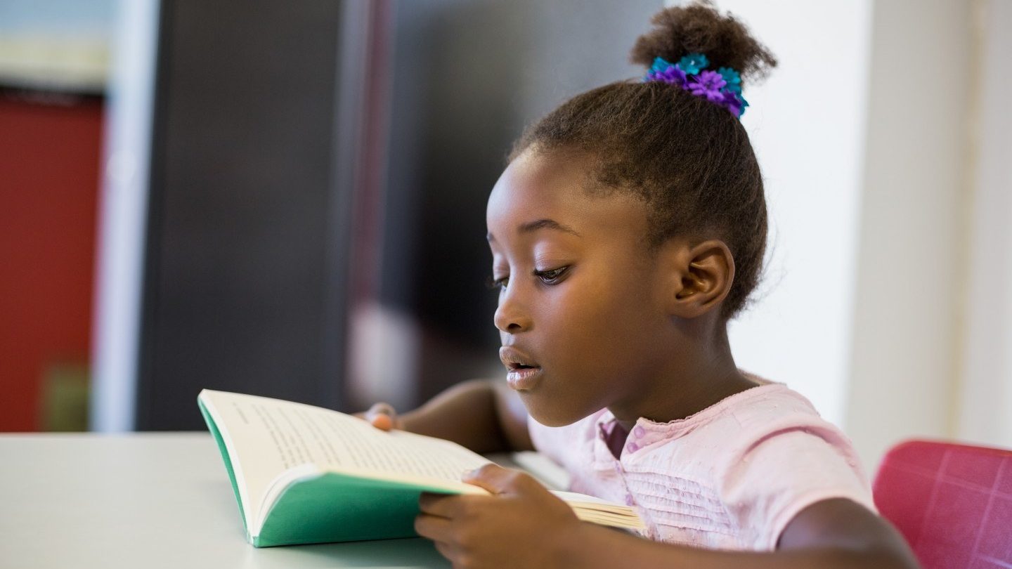 Image: A primary school-age girl reading a book at a table.