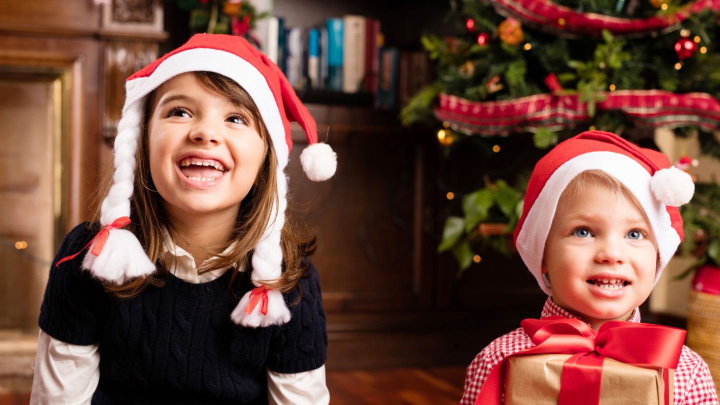 Image: A girl and a boy in Christmas hats, smiling in front of a festive background.