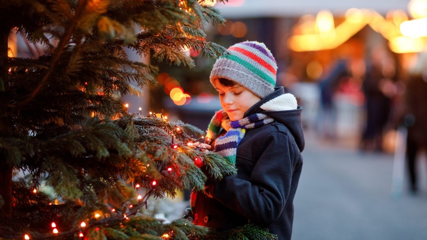 Child admiring festive tree